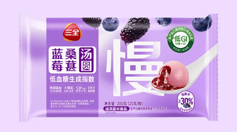 近日,三全食物上新“低GI蓝莓桑葚汤圆”。这款产物获得国际机构SGS权势巨子认证,每一口都经得起检测,馅猜中添加≥30%蓝莓桑葚果肉,浓重的莓果酸甜充盈口腔清新不腻,配方简练,0添加。产物采用“慢升糖”配方,采用白芸豆提取物和青稞粉入皮,甘旨又。